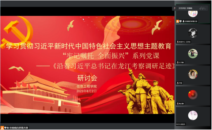 为深入学习贯彻新时代思想主题教育,弘扬时代精神。8月2日晚七点,信息工程学院宋楠楠老师组织信息工程学院教师党支部22名教师党员、信息工程学院学生党支部54名学生党员召开以“牢记嘱托,全面振兴”为主题系列党课——《沿着习近平总书记在龙江考察调研足迹》党课学习研讨会。