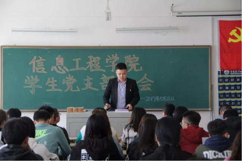 为加强基层党组织建设,吸收更多优秀入党积极分子加入党组织,5月28日,信息工程学院学生党支部在二教409召开支部大会。会议由学生党支部书记黄家政主持,信息工程学院党总支书记毛雷、团总支书记张宏鹏、以及学生支部全体正式党员、预备党员及部分党外人员参加此次大会。