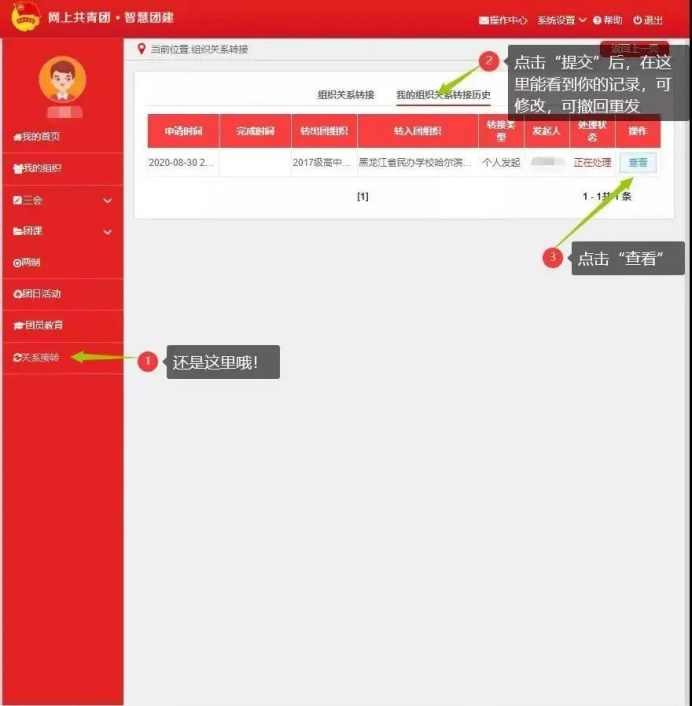 * 如果转出团支部为了“省事儿”将所有团员都发起转接,遇到这种情况,团员不要点击,与转出团支部进行确认即可。