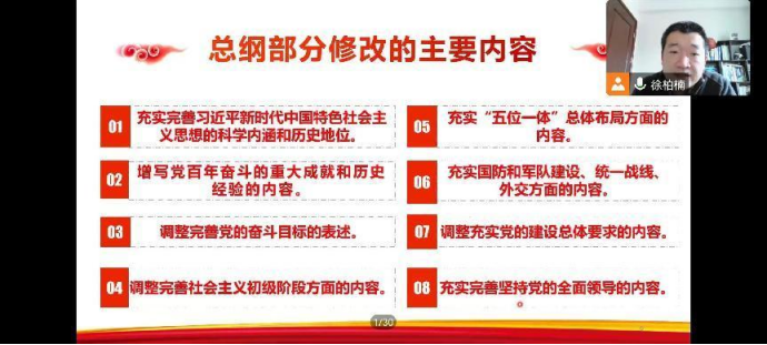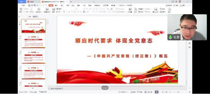 随后,主讲人徐柏楠老师正式开启了本期的党课学习,课堂中,徐柏楠老师主讲了《中国共产党章程(修正案)》的内容,通过丰硕的知识经验、独特的个人见解为与会学员们上演了一场生动而深刻的讲课。学员们纷纷表示,通过此次党课的学习,发现自身还有着许多缺点和不足,距成为一名真正的共产党员还有一定的差距,决心刻苦学习,自觉用党员标准严格要求自己,自觉接受组织考验,争取早日入党。