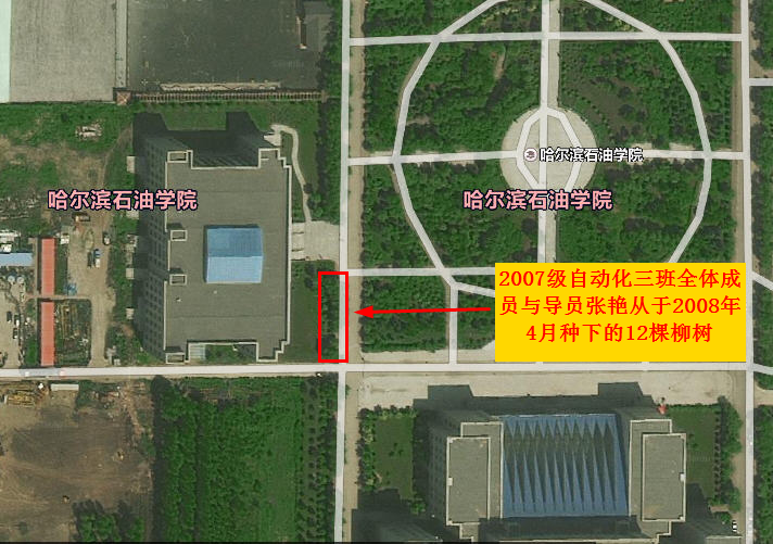 校友寄语:转眼间,我们已毕业近6年。 2008年4月,我们07级自动化三班全体成员在导员张艳丛的带领下,顶着小雨,在如今的校图书馆前(靠近道路的第一排)种下了12棵柳树,它们见证了我们的大学四年,见证了我们青葱岁月,它们是我们30位兄弟姐妹在母校留下的最生动的“痕迹”。下图为我们种植的柳树位置,恳请全体师生继续爱护它们,更希望希望它们能继续陪伴各届师生共同成长。见证母校的成长与发展。