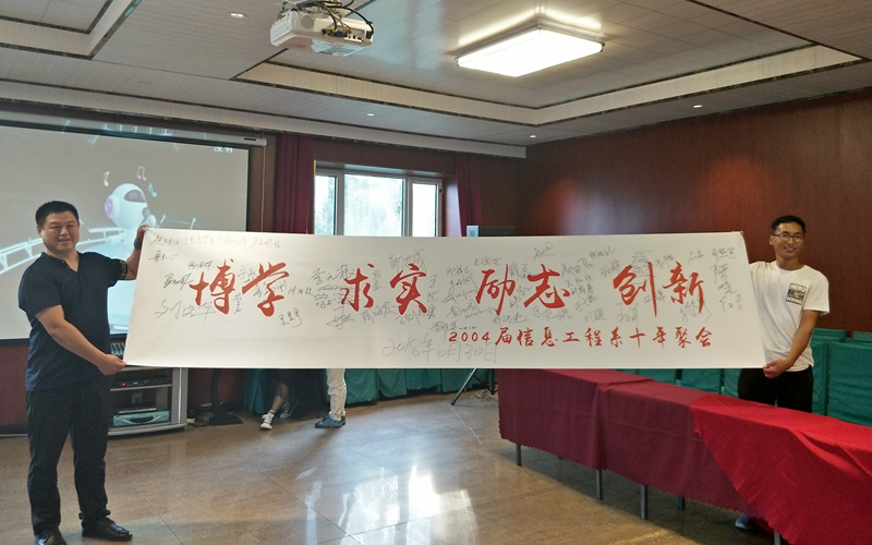 随后,校友们各自介绍了阔别母校10年间自身工作、生活等方面的发展情况,感谢学校和学校领导、老师的教诲和关心。校友们纷纷表示一定会铭记师恩,为母校争光,一如既往的关注和支持母校的发展,为母校的发展贡献自己的智慧和力量。最后,全体校友向母校馈赠了写有“博学求实、励志创新”校训的字幅,同时都在字幅上签上了自己的名字。浓浓师生情,真挚同学意,座谈会现场的气氛,温馨而融洽,感动感染着现场的每一个人。