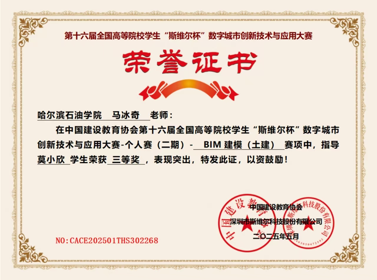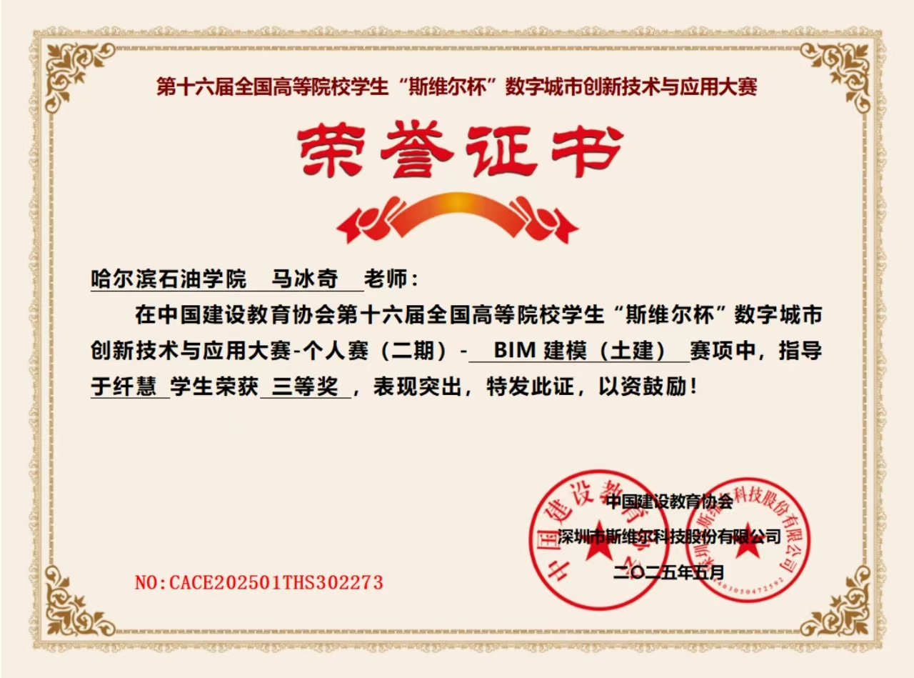 个人赛(二期)- BIM 建模(土建) 赛项中,马冰奇老师指导,于纤慧学生荣获三等奖