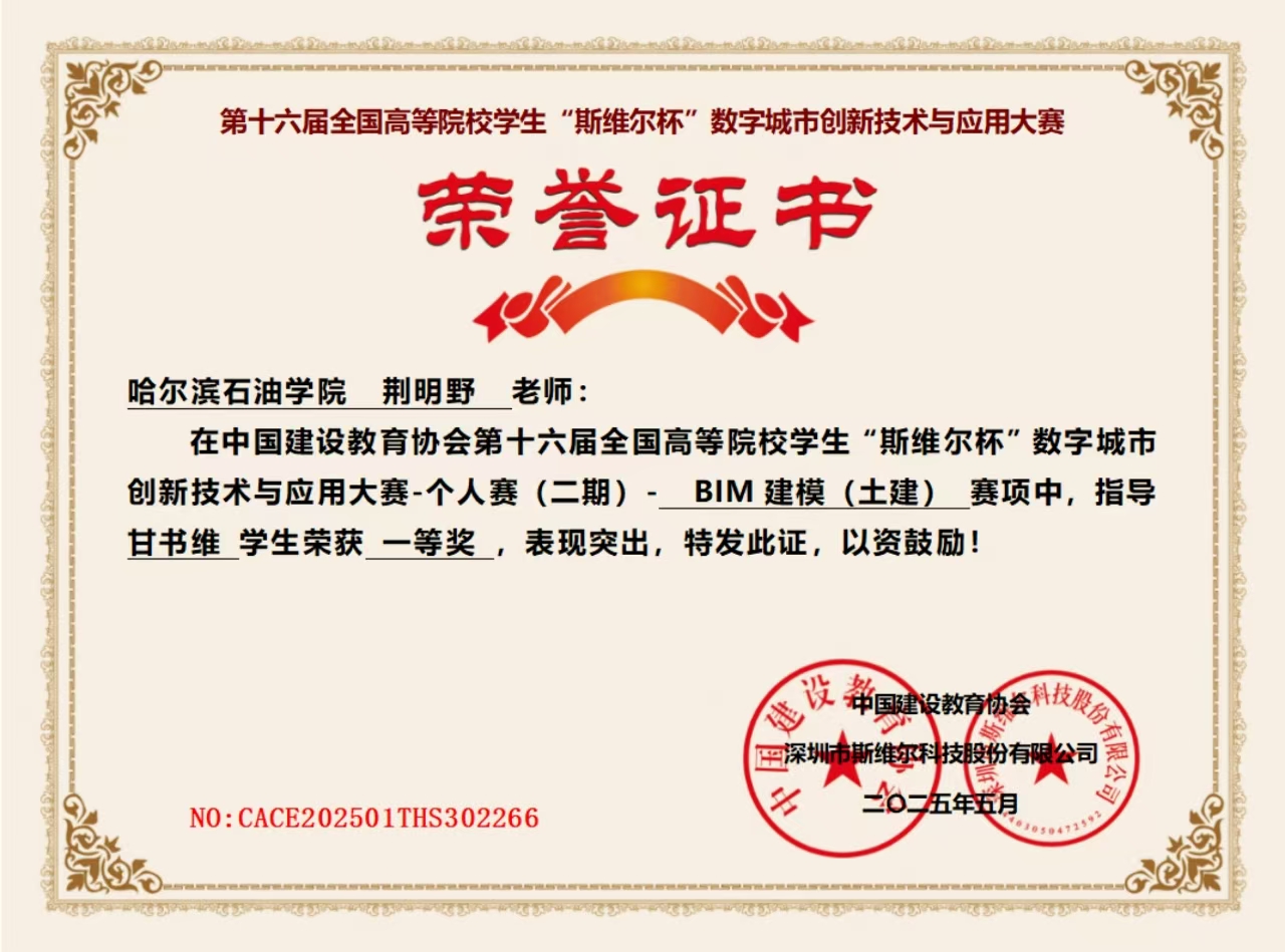 个人赛(二期) - BIM 建模(土建) 赛项中,荆明野老师指导,甘书维学生荣获一等奖