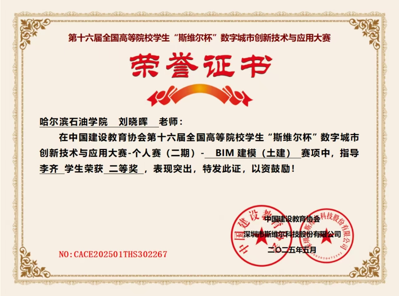 个人赛(二期)- BIM 建模(土建) 赛项中,刘晓晖老师指导,李齐学生荣获二等奖