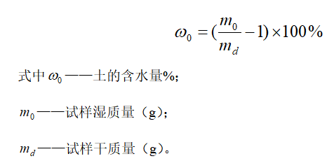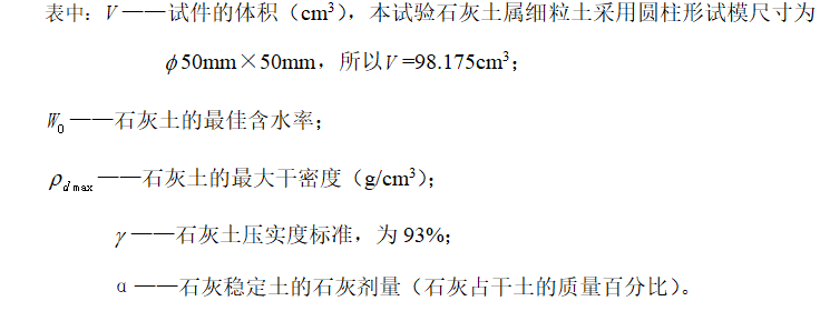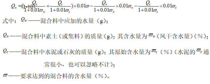 当起始含水量的试样击实后,可将试样搓散,然后加水拌合,但不需闷料,每次约增加2~3%的含水量,其中有两个大于和两个小于最佳含水量,所需加水量按下式计算:
