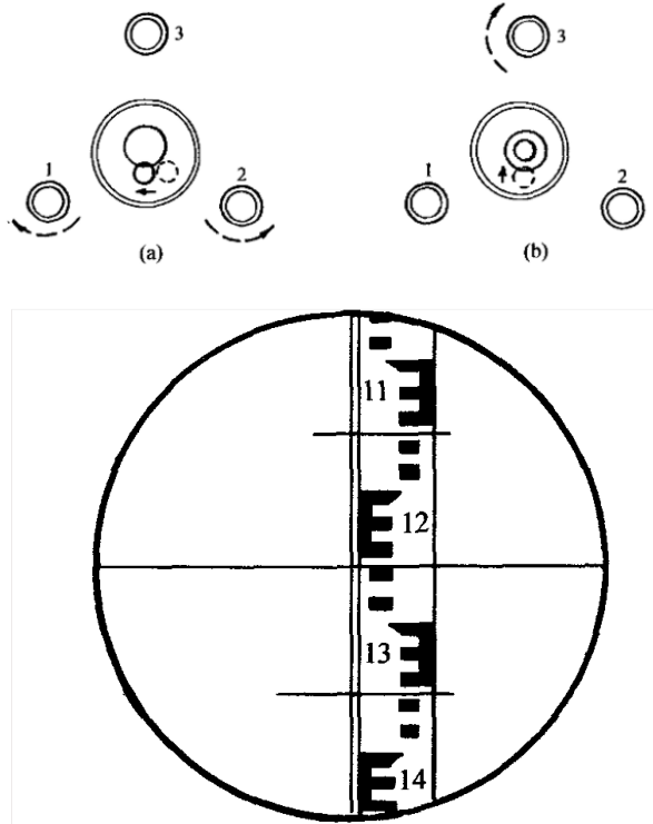 圆水准器整平图后瞄准水准尺与读数,瞄准水准尺首先将望远镜对着明亮的背景(如天空或白色明亮物体),转动目镜对光螺旋,使望远镜内的十字丝像十分清晰(此后瞄准目标时一般不需要再调节目镜对光螺旋)。然后松开制动螺旋,转动望远镜,用望远镜上方的粗瞄准瞄准水准尺,大致进行物镜对光并在望远镜内看到水准尺像。此时立即制紧制动螺旋,转动水平微动螺旋,此时视线即为水平视线。
