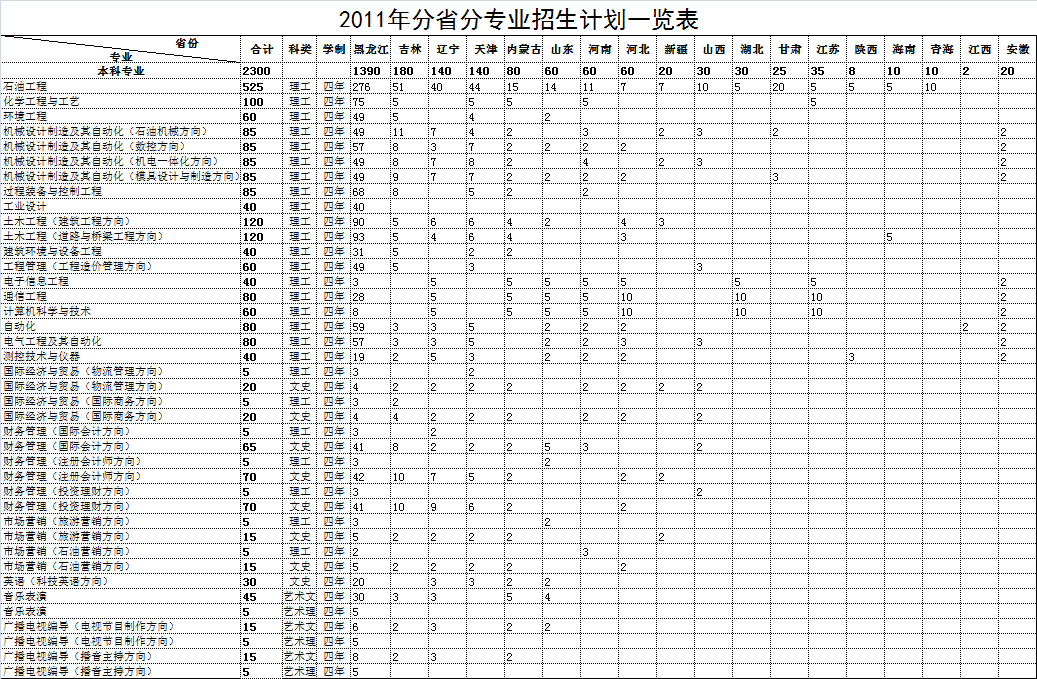 2011年分省分专业招生计划一览表