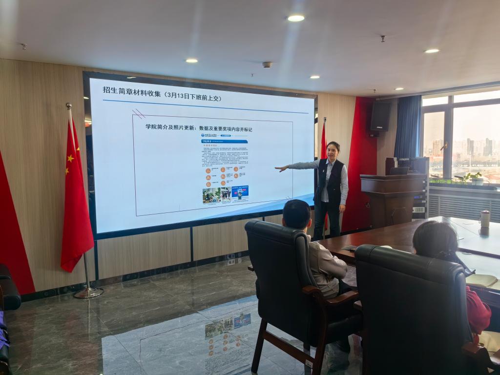 会议由招生与校友联络处处长刘洋主持,并详细介绍了2025年招生工作的总体安排和具体措施。她表示,今年学校将继续优化招生政策,拓宽宣传渠道,充分利用新媒体平台,提升学校的社会影响力。同时,她还对招生宣传、招生咨询会、专升本宣传等工作进行了具体部署。